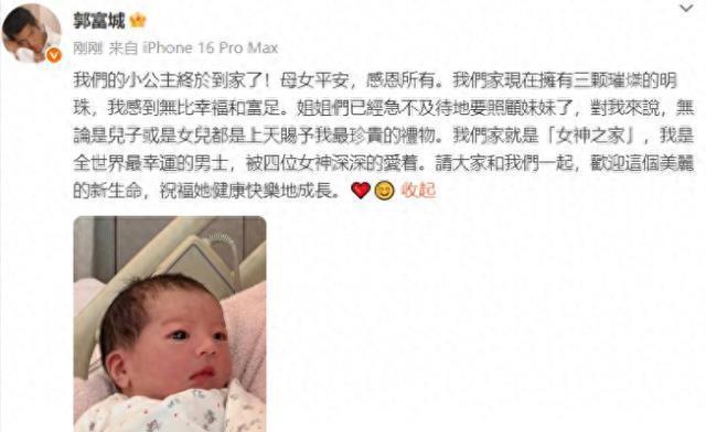 刚刚郭富城官宣三胎出生,是女儿:无论是儿子或女儿都是珍贵礼物